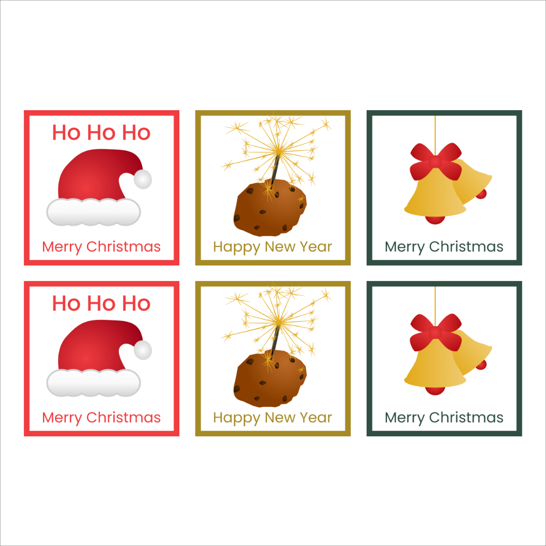 3×2 kerstkaarten met oliebol, kerstbelletjes en kerstmuts. Met Enveloppen. Dubbele kaart/klapkaart van 11x11cm